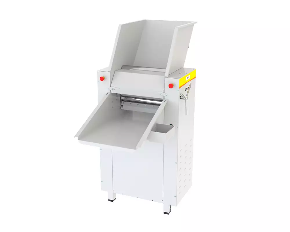 Possui proteção móvel intertravada, que impede o acesso aos rolos pela parte interna (entrada da massa) e que ao ser aberta efetuara a parada imediata dos rolos;