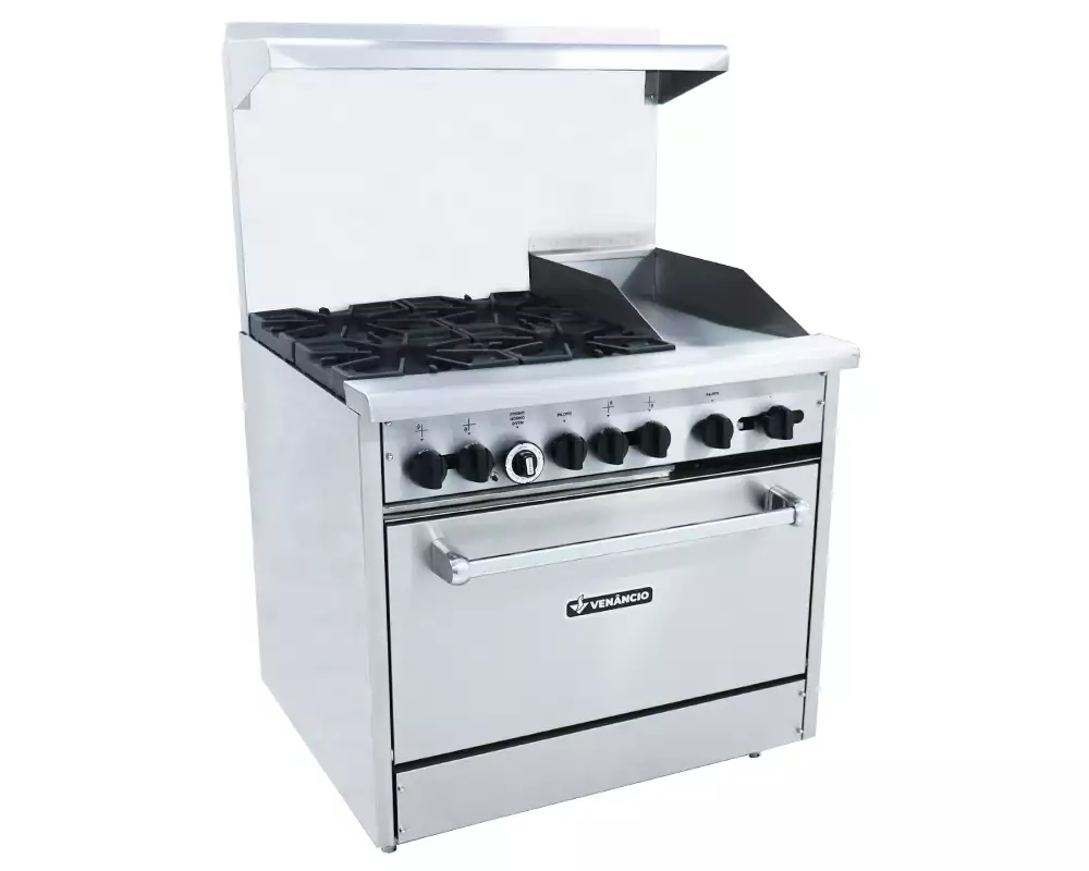 Disponível nos modelos de 4 queimadores com forno, 4 queimadores com forno e chapa, 6 queimadores com forno e 6 queimadores com 2 fornos e chapa;