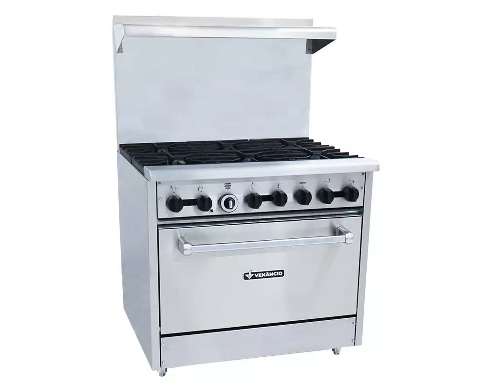 Disponível nos modelos de 4 queimadores com forno, 4 queimadores com forno e chapa, 6 queimadores com forno e 6 queimadores com 2 fornos e chapa;