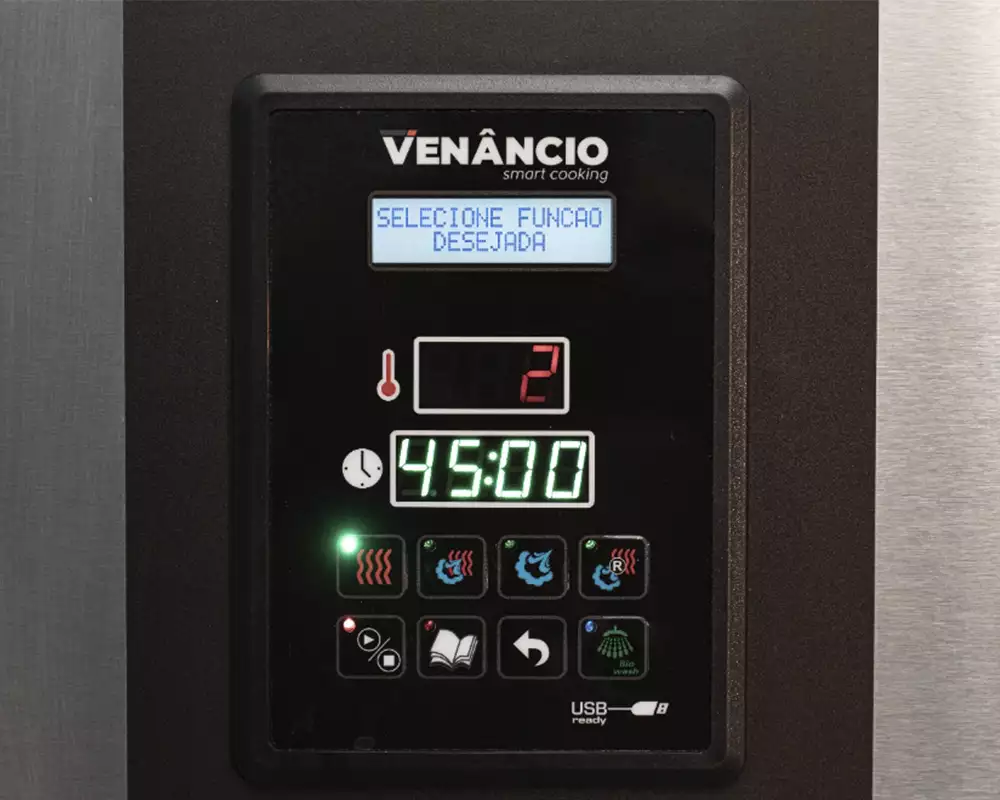 - Praticidade: O design e a engenharia aplicados na idealização deste forno foram inspirados para otimizar a operação e programação do equipamento, tornando-o o de fácil operação do mercado, sendo que qualquer pessoa pode manuseá-lo com um simples toque e sem necessidade de extensos treinamentos. O controlador foi desenvolvido após muitas pesquisas e incansáveis testes de mercado, nos quais conseguimos um processador inteligente e de fácil utilização, além disso, utiliza-se também o prático sistema de limpeza (Bio Wash) que possibilita manter o forno limpo e higienizado. Facilidade: Este forno é o único do mercado cujo controlador contém memória disponível para inserir até MIL RECEITAS, através da entrada USB. Isso possibilita, ao profissional de cozinha, utilizar as receitas disponíveis e também criar e personalizar as suas próprias, combinando tipos de funções diferentes; Painel multifunções intuitivo e de fácil manuseio;